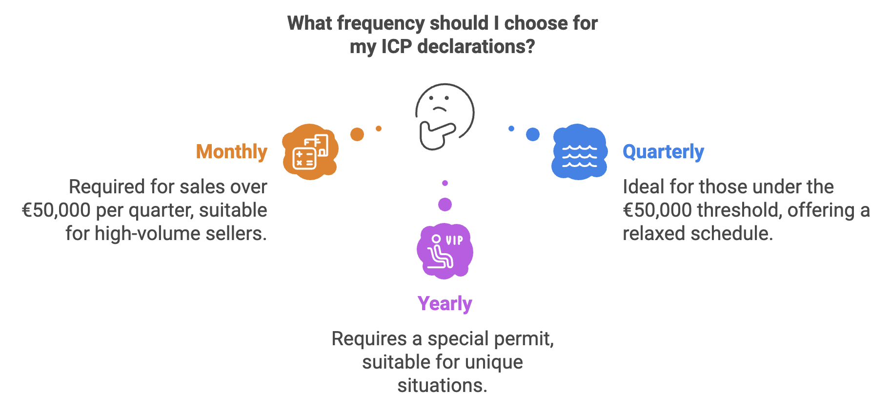 - Monthly: Always an option, but mandatory if you're selling over €50,000 of goods per quarter. High five, big seller! 🖐️