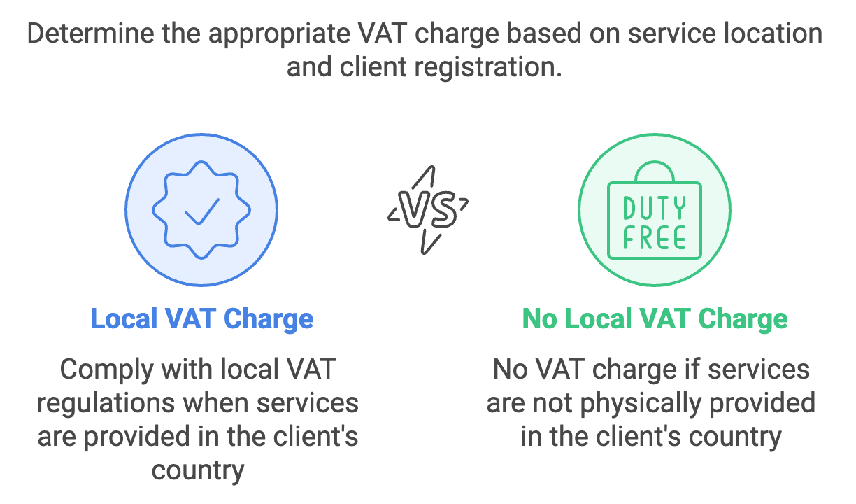 Here's a curveball for you: If you're providing services in your customer's country, you might need to brush up on their local VAT rules. That's right – you could be subject to their VAT regulations, not just the ones you're used to back home.
